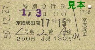 ・特別急行券(上り) 京成成田発17時15分(昭和50年12月27日発行)