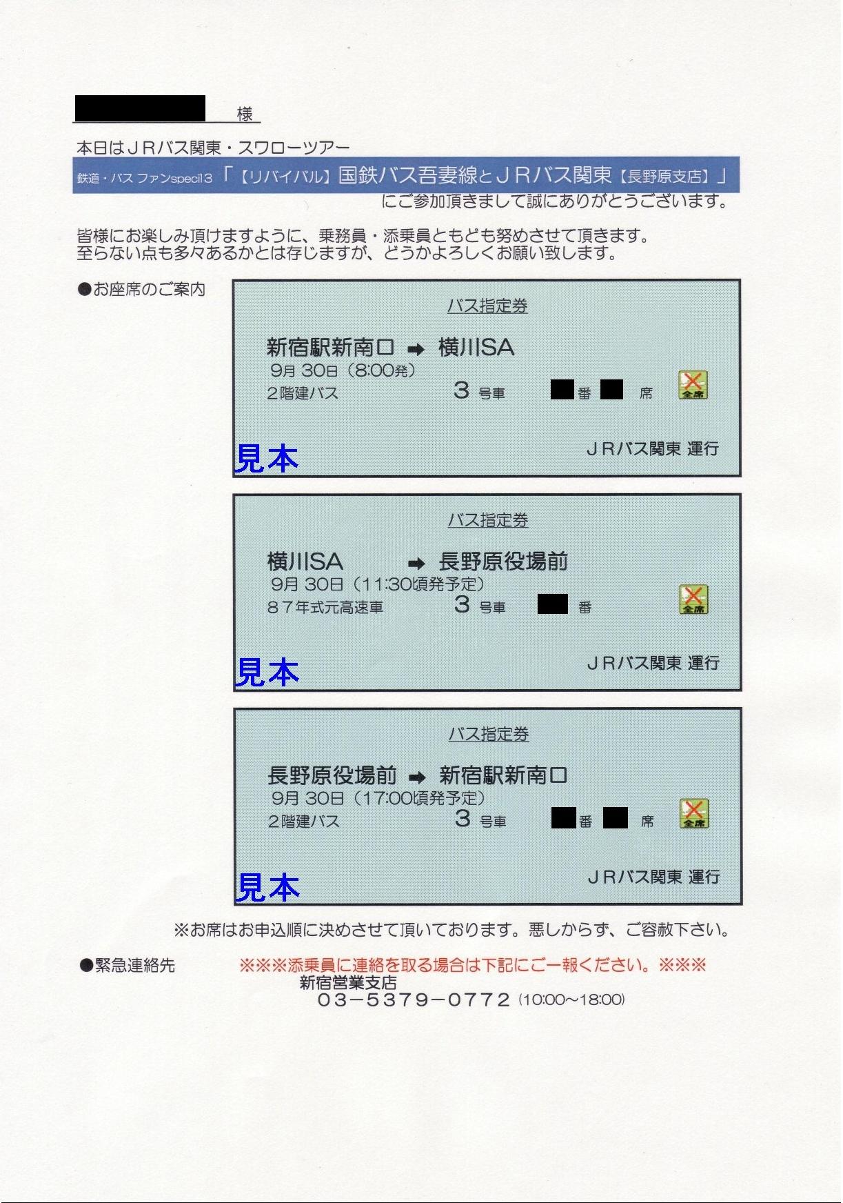このバス指定券印刷頁は個人名と各号車・座席番号入りでカラープリンタ印刷のよう。マルス券をイメージしたような3回分のバス指定券などが1枚のA4版の紙に印刷されています。