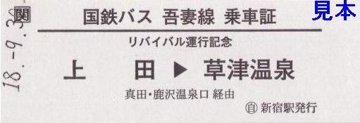 上田駅出発後に車内で配布されたもの。D型硬券。無地紋。左上に『(□囲み)関』マーク。『(○囲み)自 新宿駅発行』。意外にも見た目が全然国鉄らしくありません。無地紋なのが国鉄バス・JRバスの乗車券と違う印象を与えています。純粋な乗車記念としては良いです。