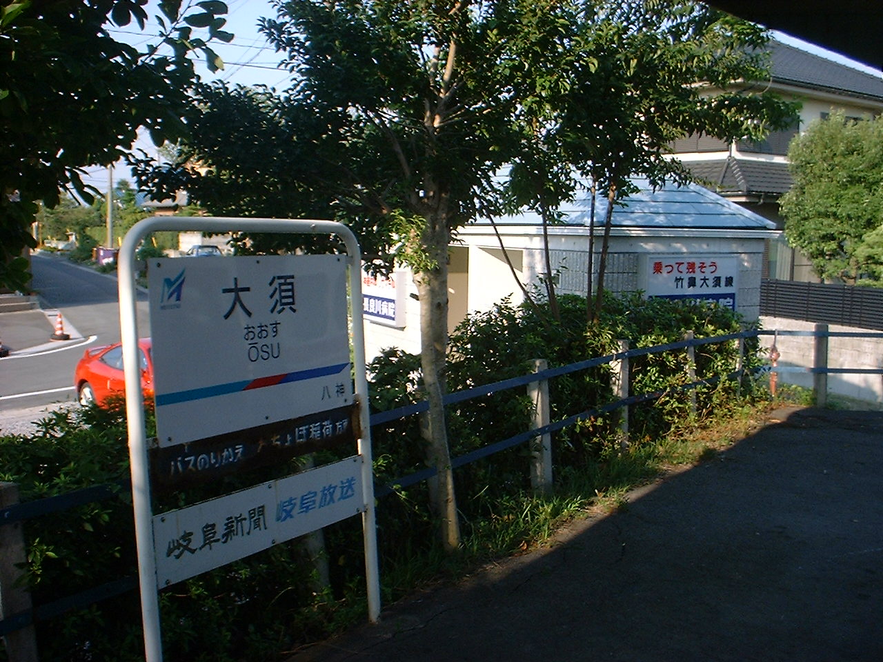 名古屋鉄道竹鼻線の江吉良~大須間は平成13年10月1日に廃止されました。私鉄廃止路線代替バスの多くは自社または系列バス会社によって運行される事が多いのですが、同区間の代替バスは沿線自治体の羽島市がタクシー会社に委託するかたちで『羽島市代替バス』として運行されることとなりました。車両と駅名標の写真は廃止直前の平成13年9月に大須駅で撮影したもの。きれいなトイレの壁面に『乗って残そう竹鼻大須線』とありますが、既に廃止直前です。