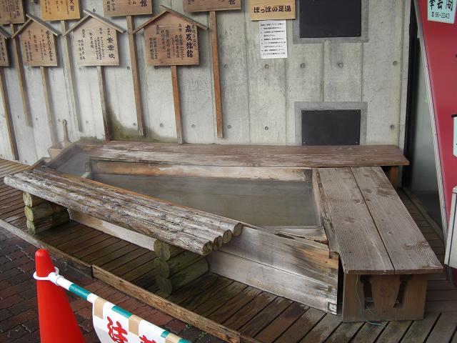 鳴子温泉駅には足湯があります。その前には落雪注意の為、カラーコーンが置いてありますが、実際に上からボロボロと雪が落ちてきますので冬季は注意が必要です。