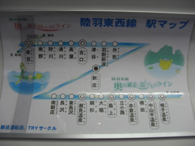 列車内の沿線案内図は陸羽東西線として小牛田〜新庄〜余目が記されています。