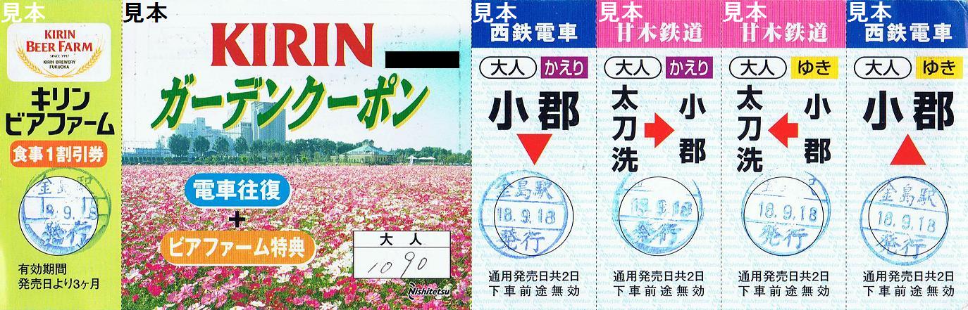 西鉄の発駅〜西鉄小郡駅間往復+甘木鉄道小郡駅〜太刀洗駅間往復+キリンビアファームお食事割引券がセットになっているクーポン。