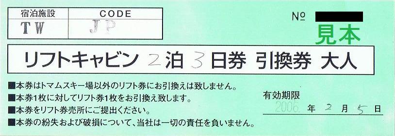 《トマムスキー場 リフトキャビン2泊3日券引換券大人用(平成18年2月3日)》