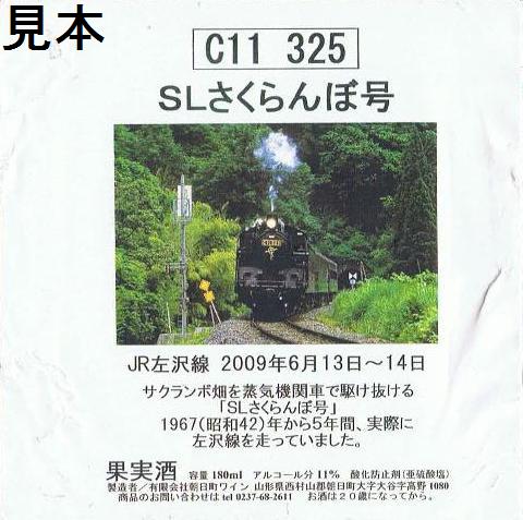 山形駅改札内特設会場では、NREによりSLさくらんぼ号などのグッズ販売が行われていました。SLさくらんぼ号のグッズは、ミニ横サボ(山形←→左沢、左沢←→山形の2種類)と、運行記念ワイン(赤、白の2種類。各400円)が販売されていました。記念ワインの製造者は、有限会社朝日町ワイン。写真は運行記念ワインのラベルです。左右の両端が各1㎝程度強力に糊付けされており、剥がしづらいのですが、きれいな写真を使用しています。あと50円くらい高くても良いので、未使用のラベルシールを付けて欲しいと思います。