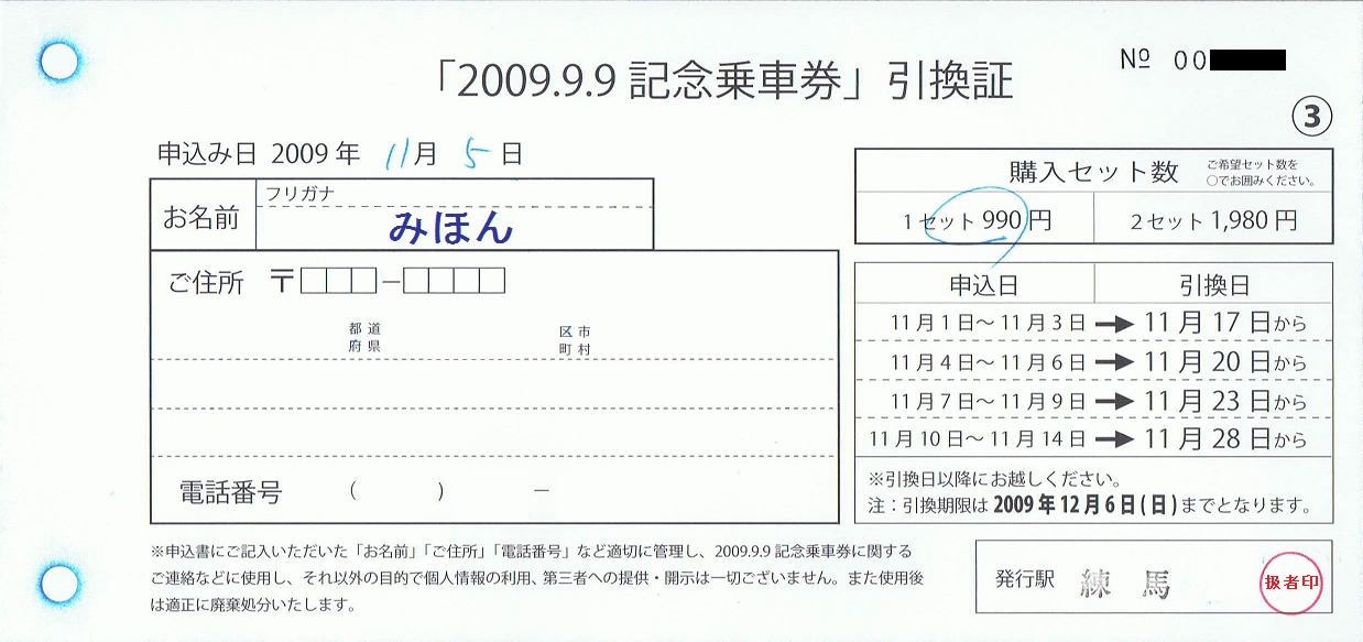 上記の「2009.9.9記念乗車券」の引換用として、駅での申込者に渡された引換証。わざわざ、このような紙を用意していたのは意外でした。引換期間が終了したので載せておきます。――――――――――――――――――――――――――――――――――――――