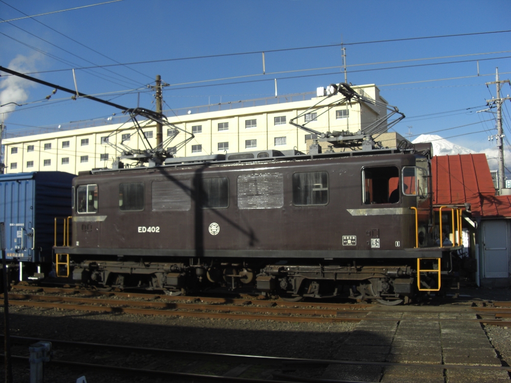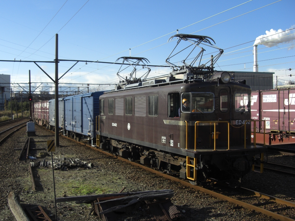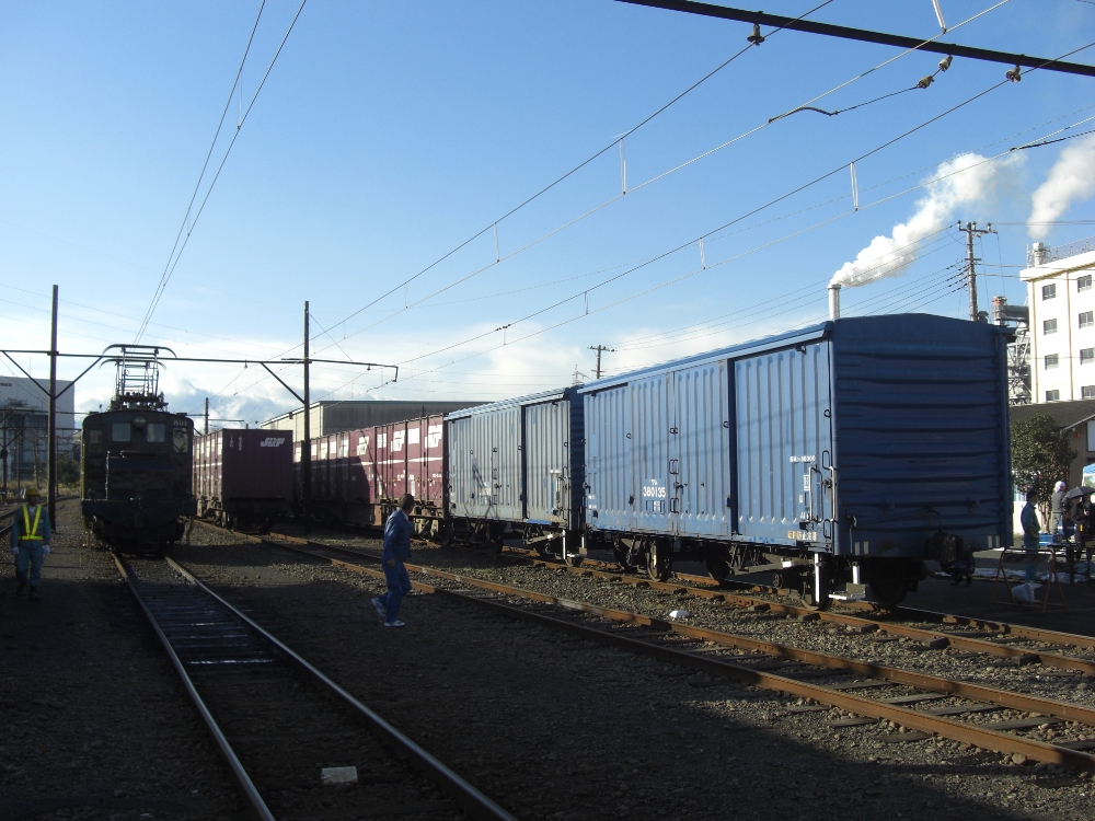 機関車まつり会場にあわせて比奈駅側線にED501、ED403、ED402が並びました。ED402はこの後に運行される定期貨物列車704レ(比奈13:03発→吉原13:16着)としての運用直前で、後ろにワム80000形5両が連結されています。
