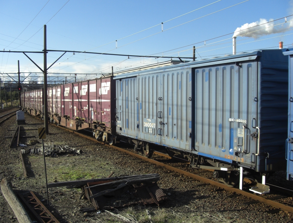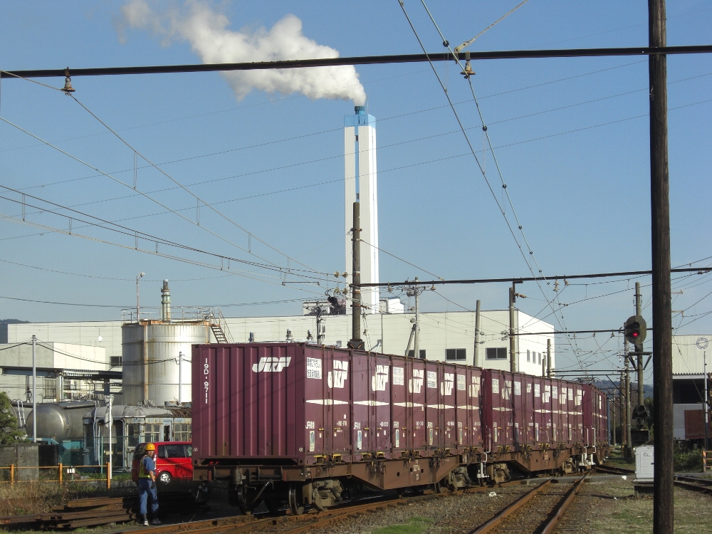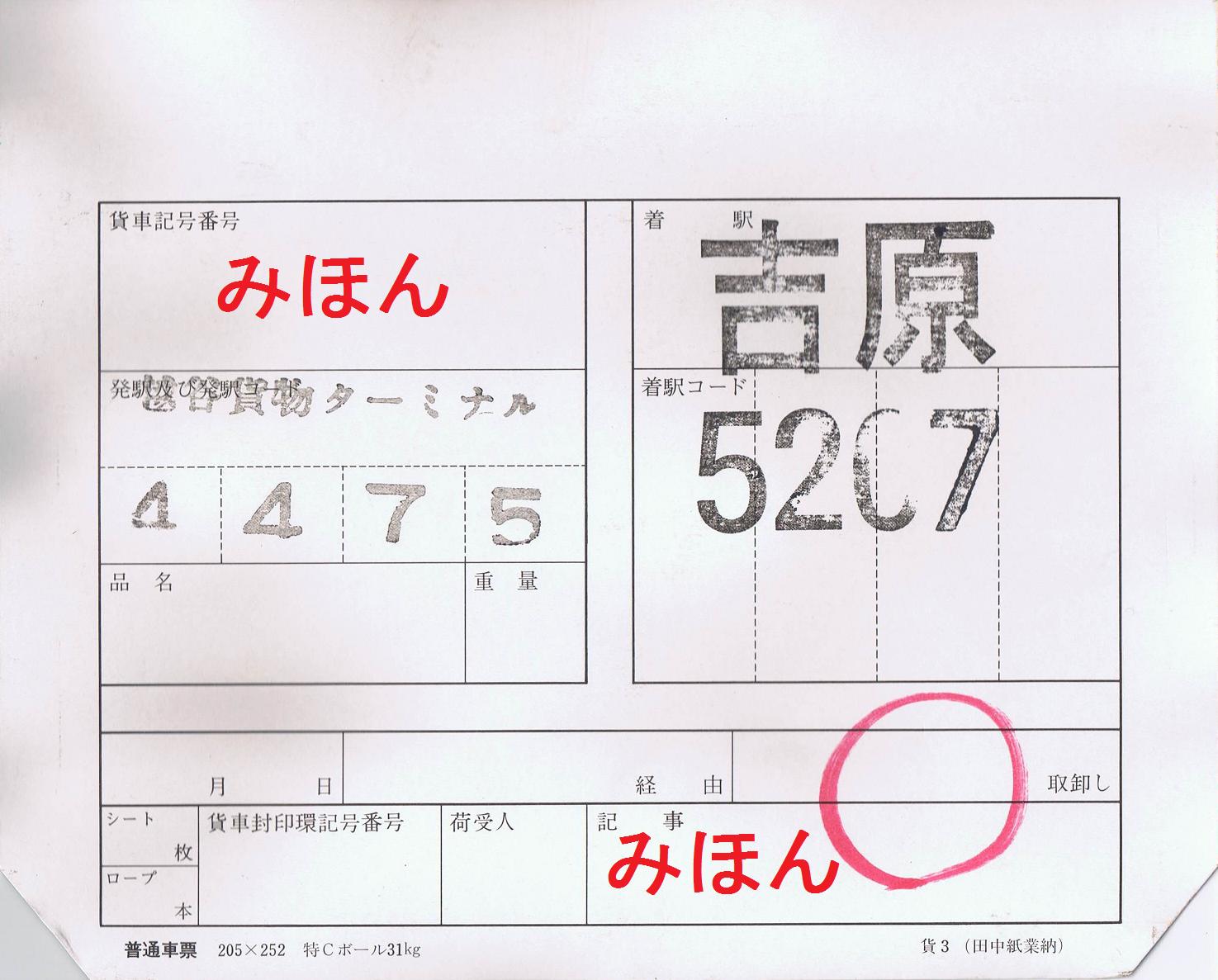 発駅(越谷貨物ターミナル駅)及び着駅(吉原駅)と、それらのコードはゴム印が押されています。右下に『田中紙業納』とありますが、株式会社田中紙業(東京都足立区)のホームページにある主要納入先に日本貨物鉄道株式会社とあるので、同社製のものと思われます。手書きで赤い○が書かれているので、空車の返送時に使用されたものでしょう。【関連記事】