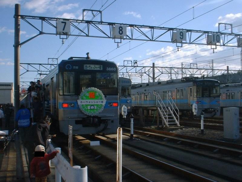 車両洗浄機を電車に乗車したまま体験できる『カーウォッシャー号』(写真左)は、3050形電車で運転されました。オリジナルの方向幕とヘッドマーク付きです。車内から洗浄されている様子を見るイベントは千葉都市モノレールでも開催された事がありましたが、どこでも人気のある企画です。