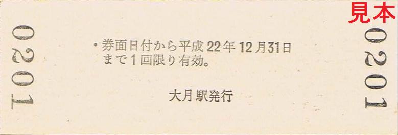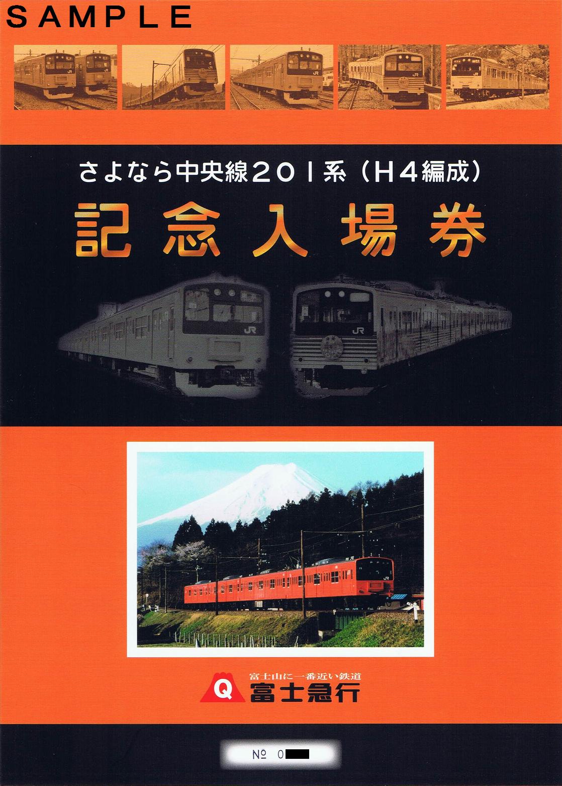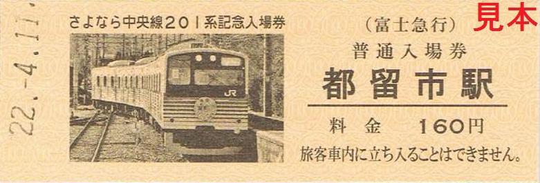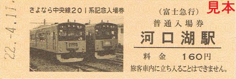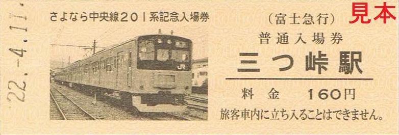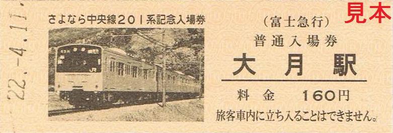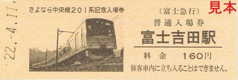 平成22年4月11日のさよなら中央線201系イベント時に発売し、平成22年4月17日からは大月駅、富士吉田駅、通信販売でも発売している記念入場券。