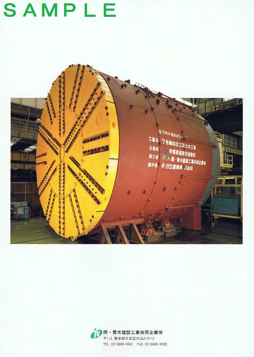 帝都高速度交通営団7号線(現在の東京地下鉄南北線)の東大前〜本駒込間の土木工事パンフレット。施工者は間・青木建設工事共同企業体。工事概要、地質概要、シールドマシンの概要だけでなく、統合型シールド自動掘進システム(HI-SDACS ハイスダックス)やセグメント自動組立装置についても触れられています。