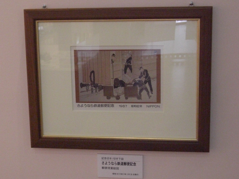 今までに発売された鉄道関連図柄記念切手の原画も展示されていました。写真は『さようなら鉄道郵便記念切手(後述)』の原画。※平成21年05月31日掲載(郵便100年、さようなら鉄道郵便北九州局)