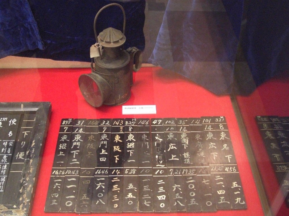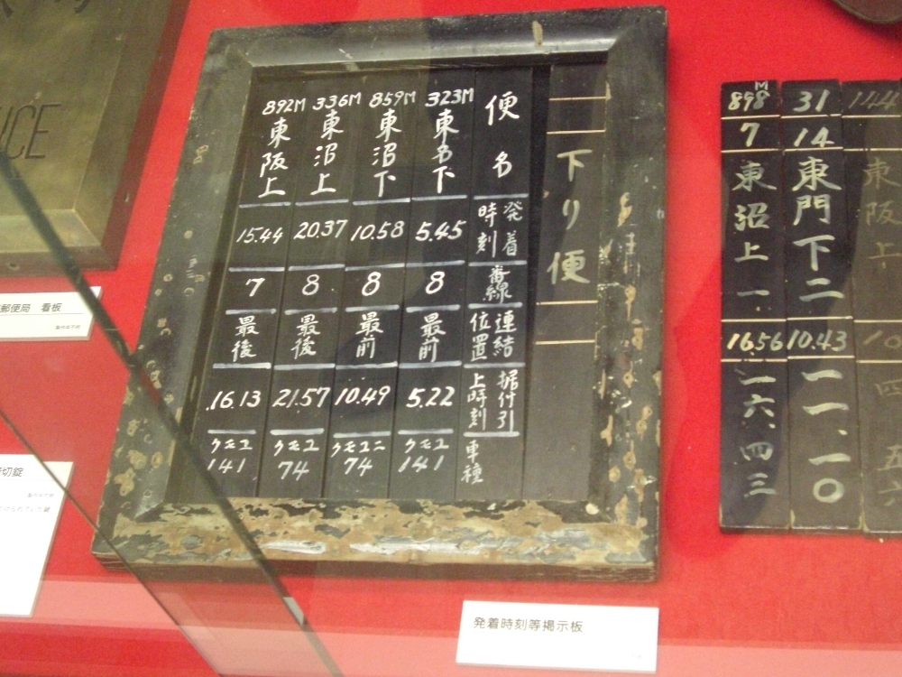 実際に鉄道郵便局で使用されていた備品等が展示されていました。写真は発着時刻等掲示版。