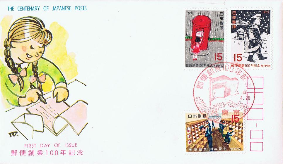 昭和46年4月に日本の郵便事業が創業100周年を迎え、3種類の記念切手が発売されました。図柄は、前年に実施されたコンクールにて郵政大臣賞を受賞した作品を再構成したもの(原画は児童による作品だった)で、うち1種類は鉄道郵便が図案化されています。写真の初日カバーでは一番下に貼り付けられている切手がそれで、鉄道郵便車内での作業風景が描かれています。