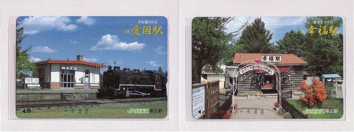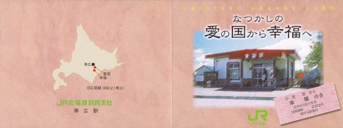 JR北海道でも愛国駅・幸福駅を題材にした記念オレンジカードを帯広駅で販売していました。1,000円カード2枚セットで2,000円。図柄はカードが現在の保存されている愛国駅・幸福駅それぞれの駅舎、台紙に愛国から幸福ゆき硬券乗車券がデザインされています。・今も愛される(旧)愛国駅