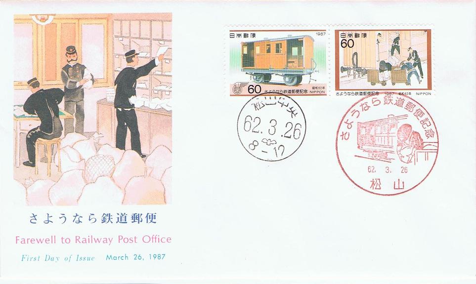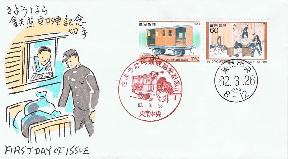 昭和61年10月に廃止された鉄道郵便を記念して、昭和62年3月に2種類の記念切手が発行されました。明治初期の鉄道郵便車と郵便現業絵巻が図案化されています。この切手を使用した初日カバーを掲載します。