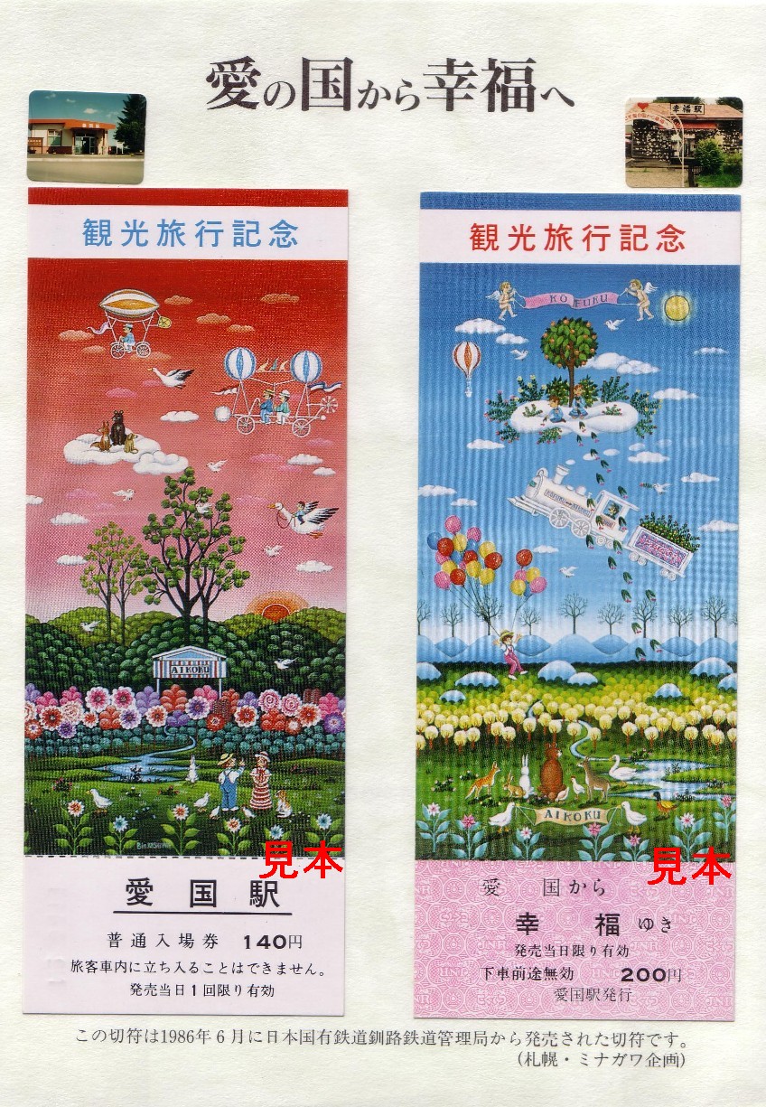 かつて国鉄広尾線の愛国駅・幸福駅の切符が大ブームだった事は鉄道マニア以外の方も御存知のことでしょう。しかし、現在、これらの駅跡周辺の売店で販売されている切符が現役時代と似ていない模造品であることは切符マニアしか知らないと思います。平成18年5月4日訪問時、私は旧愛国駅・幸福駅跡を見てきましたが、多数の観光客がこの模造品を大量に購入している様子などを見てきました。なにも知らずに縁起物と思っているのは非常に恐ろしい事で、現在では『これだけが本物!』といえる十勝バスの愛国幸福切符をみんなが買えば地域の活性化にも役立つのに…と思ってしまいます。
