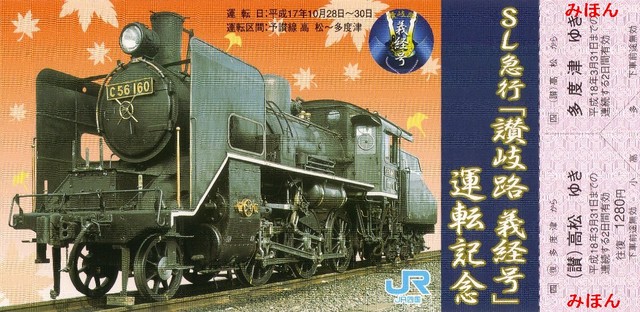平成17年10月、SL急行讃岐路義経号が予讃線高松〜多度津間に運行されました。JR西日本のC56160蒸気機関車がJR四国14系客車を牽引していました。