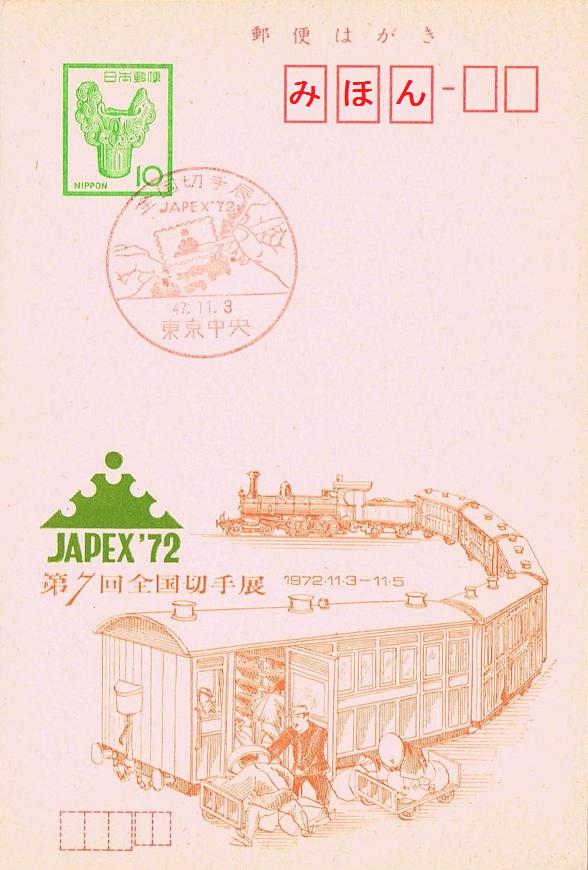 昭和47年に開催された第7回全国切手展記念の官製はがきで、鉄道郵便の図柄のものです。記念官製はがきと小型印にこれ以外の種類があるのか分かりません。