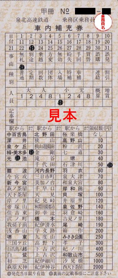 おそらく平成3〜5年頃に入手した券。平成7年開業の和泉中央駅が入っておらず、南海の駅名に岸ノ里駅(平成5年に玉出駅と統合し岸里玉出駅となる)が印刷されています。