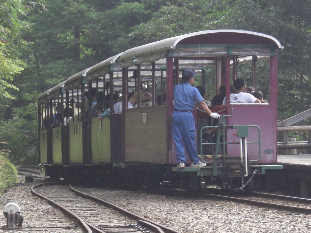 森林鉄道記念館停車場を出発した列車を後ろ側から撮影。客車には保安要員が複数名乗車しており、定年を迎えられた方を嘱託で雇っていたとしても結構な人件費が掛かりそうです。