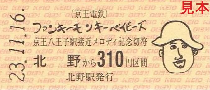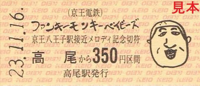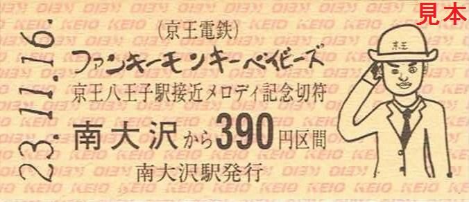 平成23年11月16日から京王八王子駅の列車接近メロディーにファンキーモンキーベイビーズの楽曲が使用される事を記念した乗車券。オルゴール付き台紙(写真左…外側表、写真右…内側)とB型硬券4枚のセットです。