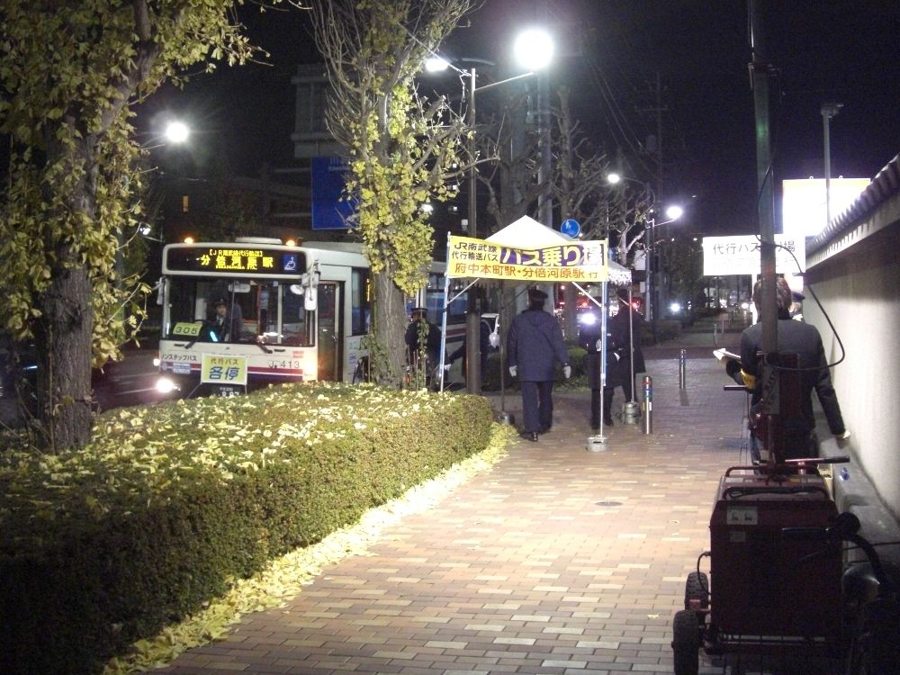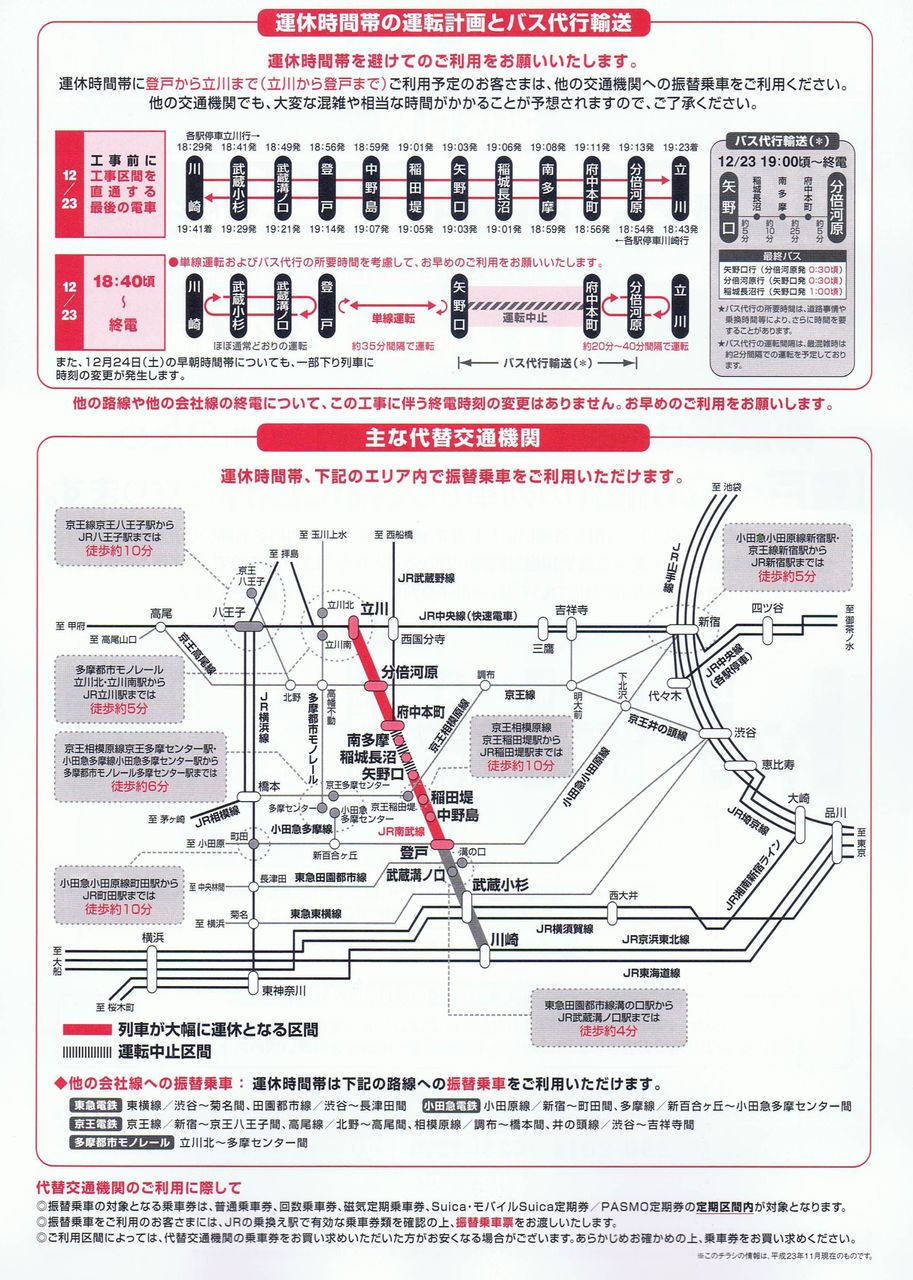平成23年12月23日に南武線高架化工事が実施され、同日19時頃より南武線の矢野口〜府中本町間が運休、矢野口〜分倍河原間に代行バスが運行されました。代行バスの運行について、今回は京王電鉄バスグループ(京王電鉄バス、京王バス中央、京王バス東、京王バス南)のみが担当しており、関東バスの便は運行されませんでした(下記リンクより平成21年運行時の記事をご参照下さい)。【代行バス運行区間の乗車券等】