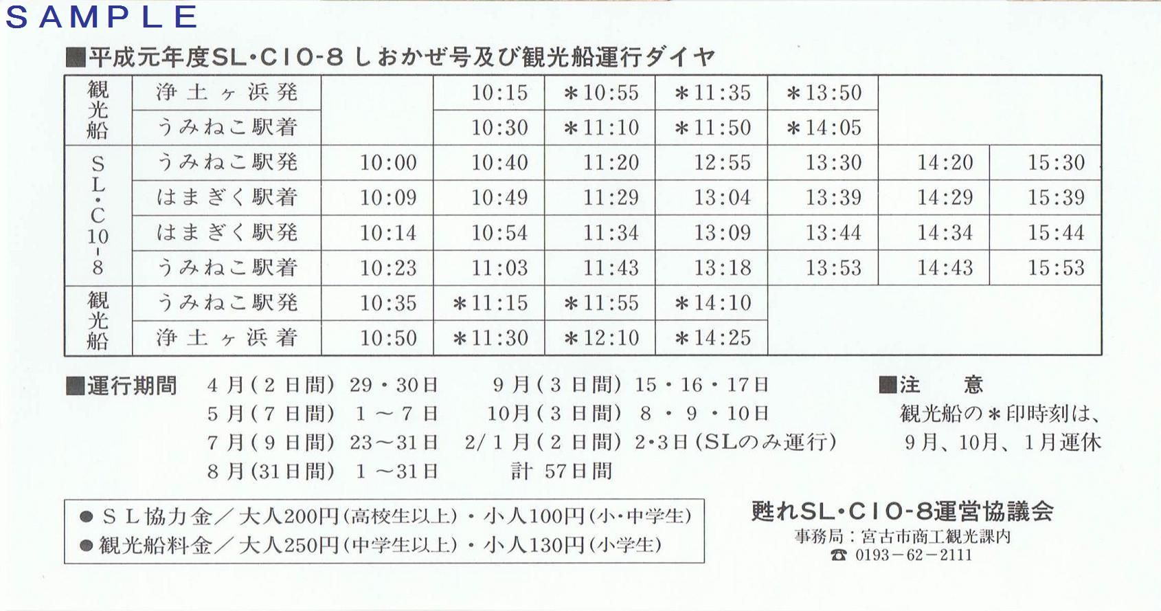 昭和62年7月から数年間、宮古市と複数の団体で構成される甦れSL・C10-8運営協議会により、宮古〜宮古港間の山田線貨物支線跡を利用したSLリアス線(はまぎく〜ミニ浄土ヶ浜公園〜うみねこ間の1.4)の運行が行われていました。鉄道事業法に基づかない保存鉄道です。宮古市が所有するC10-8蒸気機関車を甦れSL・C10-8運営協議会が無償借り受け。車両の運転管理は三陸鉄道に委託していました。
