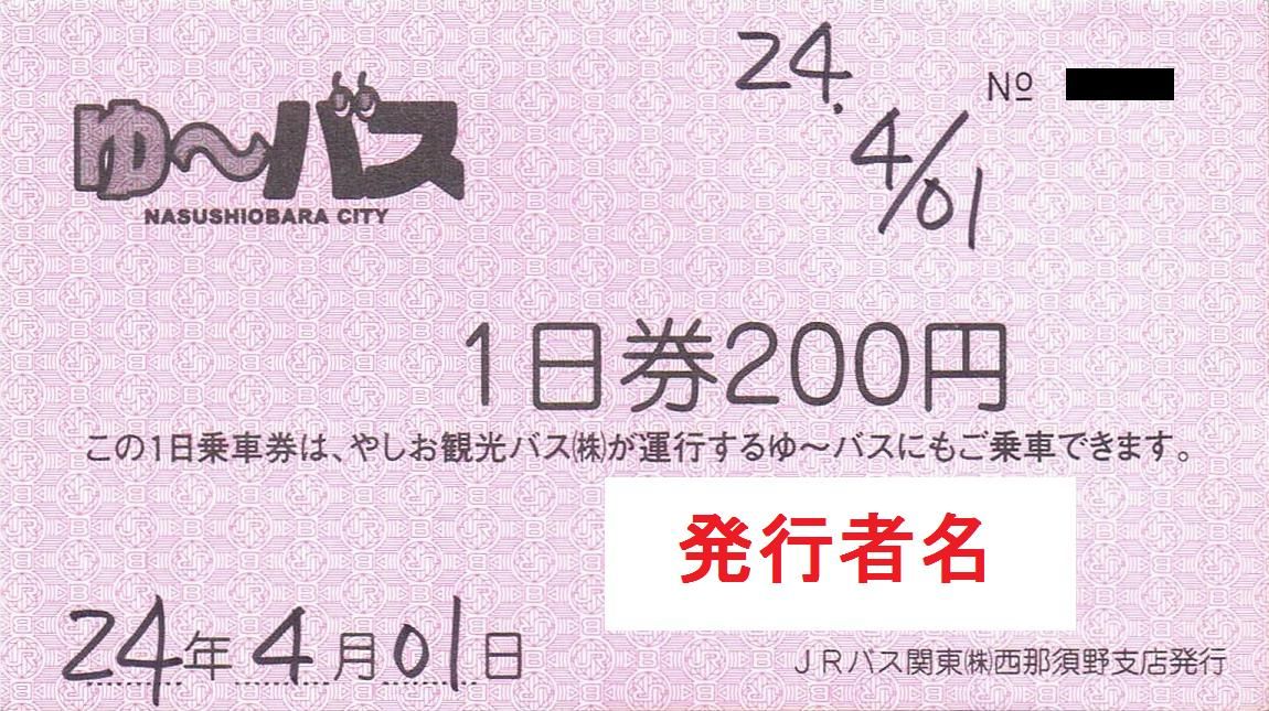 上三依塩原温泉口駅停留所に停車中のバス車内で購入。小児用(200円)はJR-Bピンク地紋。大人用(400円)はJR-B黄緑地紋。購入時に発行日、使用日、発行者名を記入するとの事。======================================