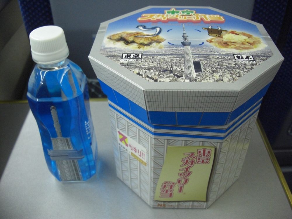 東武鉄道と日本テレビ系の情報番組『スッキリ!!』のコラボレーションによる浅草駅弁で、東京スカイツリータウン®グランドオープンの記念弁当でもあります。調整がJR東日本系列のNREであるためか、発売箇所は東武鉄道浅草駅・北千住駅・一部のスペーシア車内だけでなく、JR東日本駅構内にある駅弁屋(東京、新宿)でも取り扱われていました。税込1,500円でスカイツリーデザインのミネラルウォーター付き。私は平成24年4月1日に浅草駅改札内・特急ホーム前売店で購入しています。