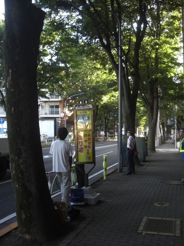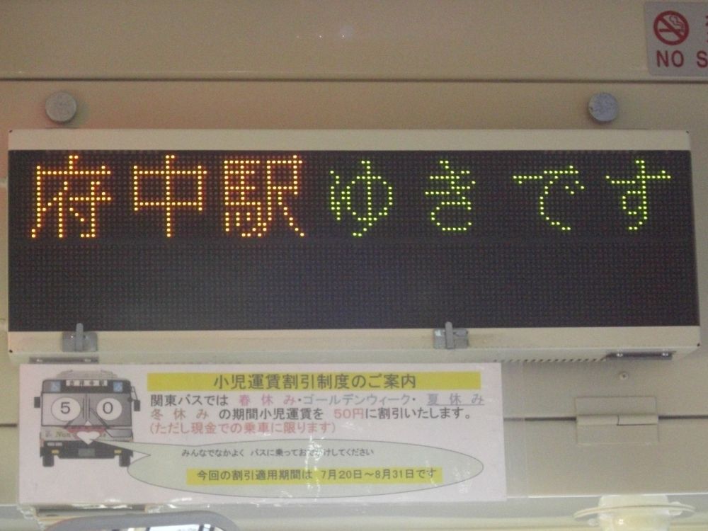 それから前乗り・後降りのバスが大半でしたが、一部のバスではそれが統一されておらず、柴崎駅停留所(下り)で私は5分待っていましたが、バス到着の数十秒前に停留所に来た酔っ払いに空いた後ろドアから割り込み乗車されました。普段の電車でもそうですが割り込み乗車は世界一気分の悪いものです。そういえば地上時代の京王線調布駅では8両編成と10両編成の列車停止位置を数メートルずらしていましたが、あの乗車案内の不徹底さ(次に来る列車の編成両数に関する案内放送が少なすぎ。電光掲示板は見にくい)とそれが原因で割り込みされる事が非常に多かった。何だか共通しています。