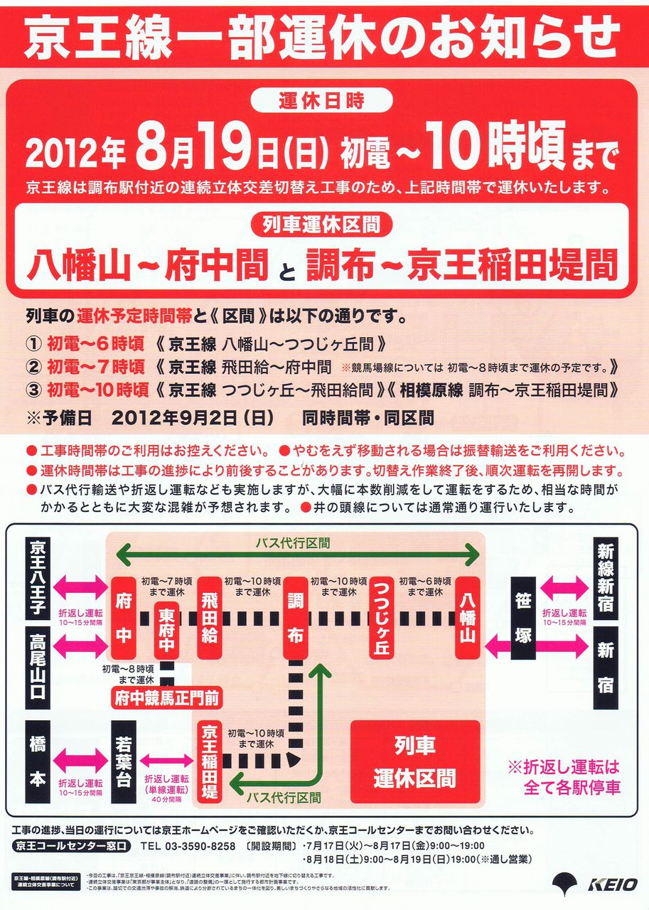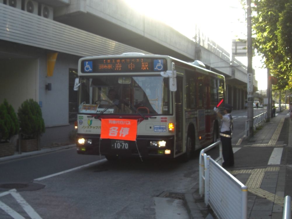 平成24年8月19日の調布駅付近連続立体切替え工事(調布駅付近地下化)に伴う京王線八幡山〜府中間運休中に京王線代行バス(八幡山駅〜つつじヶ丘駅北口〜調布駅北口〜飛田給駅〜府中駅)が運行されました。当初の予定では京王線八幡山〜つつじヶ丘間の運転再開時刻が6時頃。飛田給〜府中間の運転再開時刻が7時頃を予定していましたが、それぞれ遅くなり7時10分頃と7時50分頃に運転再開されたため、これらの区間の代行バスも比較的遅い時間帯まで運行されていました。なお、全線の再開時刻は早くなり9時40分頃となりました。
