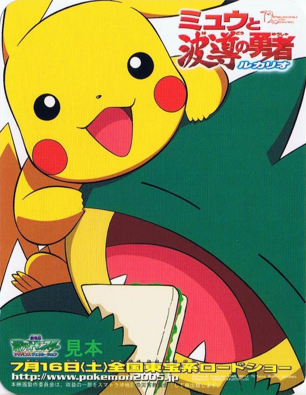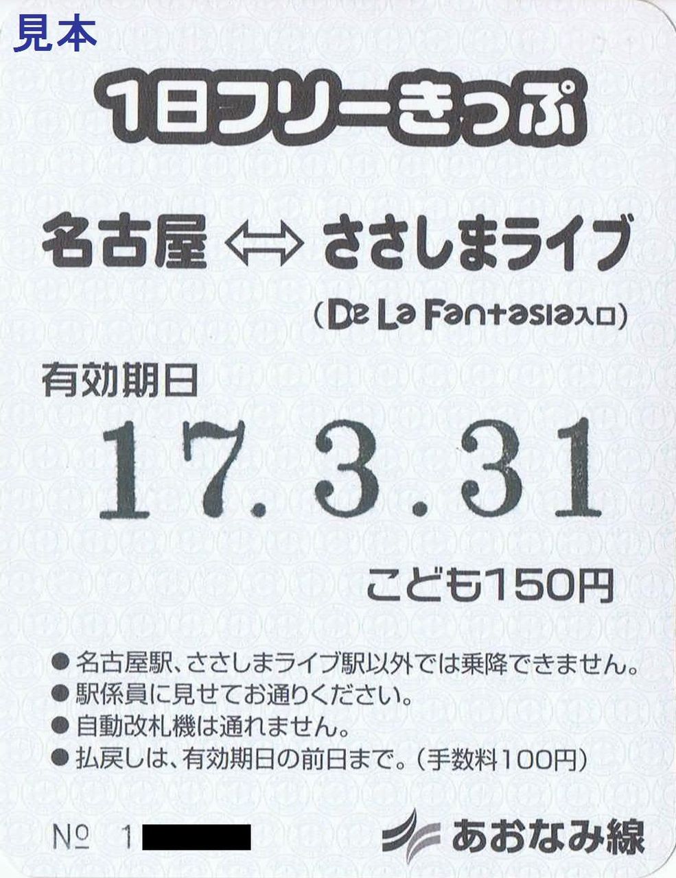 愛知万博ささしまサテライト会場オープン記念として発売された名古屋〜ささしまライブ間のみフリー乗降可能な乗車券で、小児用は150円、大人用は300円で発売されました。裏面はポケットモンスターの映画『ミュウと波導の勇者ルカリオ』のPRになっています。