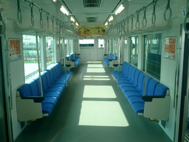 写真左は名古屋駅にて撮影。写真右は金城ふ頭駅停車中に撮影した車内。