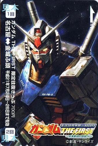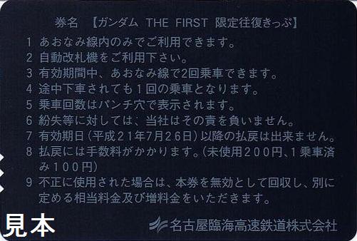 ポートメッセなごやで開催されるイベント『生誕30周年記念祭 in NAGOYA ガンダムTHE FIRST 〜未来創造の世紀へ〜』にあわせて発売された限定往復きっぷ。平成21年5月30日〜6月26日は名古屋テレビ放送(イベントの主催者で、ガンダムシリーズの初代製作テレビ局)のホームページからの予約による通信販売。その後はあおなみ線名古屋駅改札で販売されました。大人用700円のみの発売。