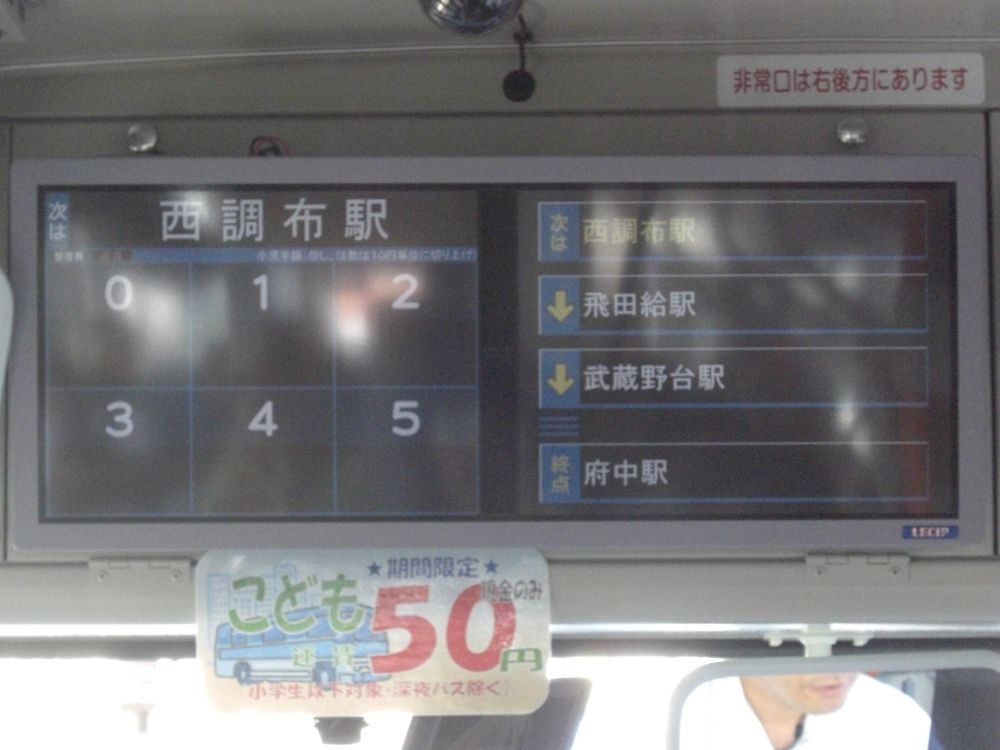 写真左は私が乗車した府中駅行き西武バス担当便。右はその車内の案内表示。