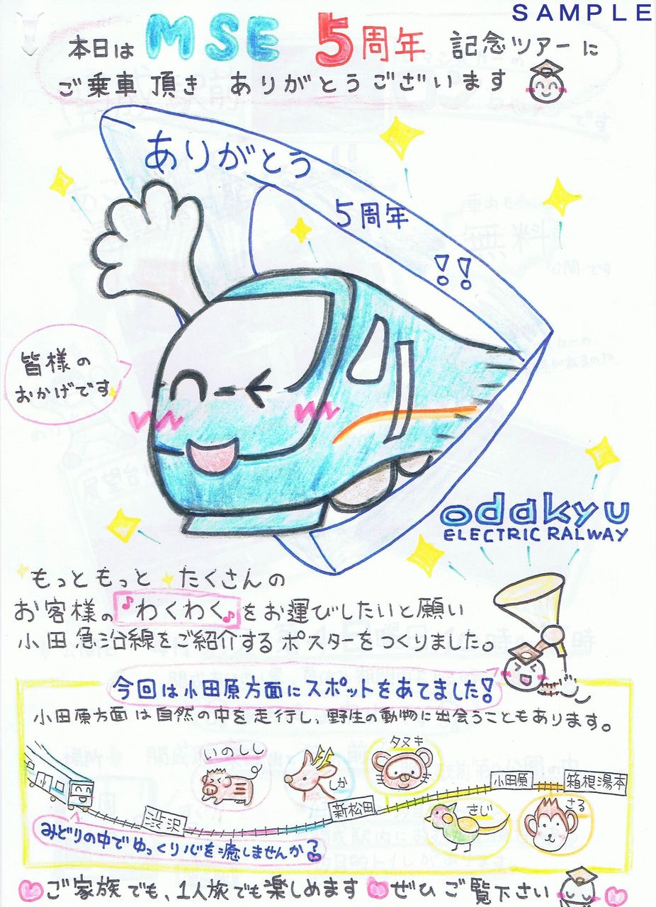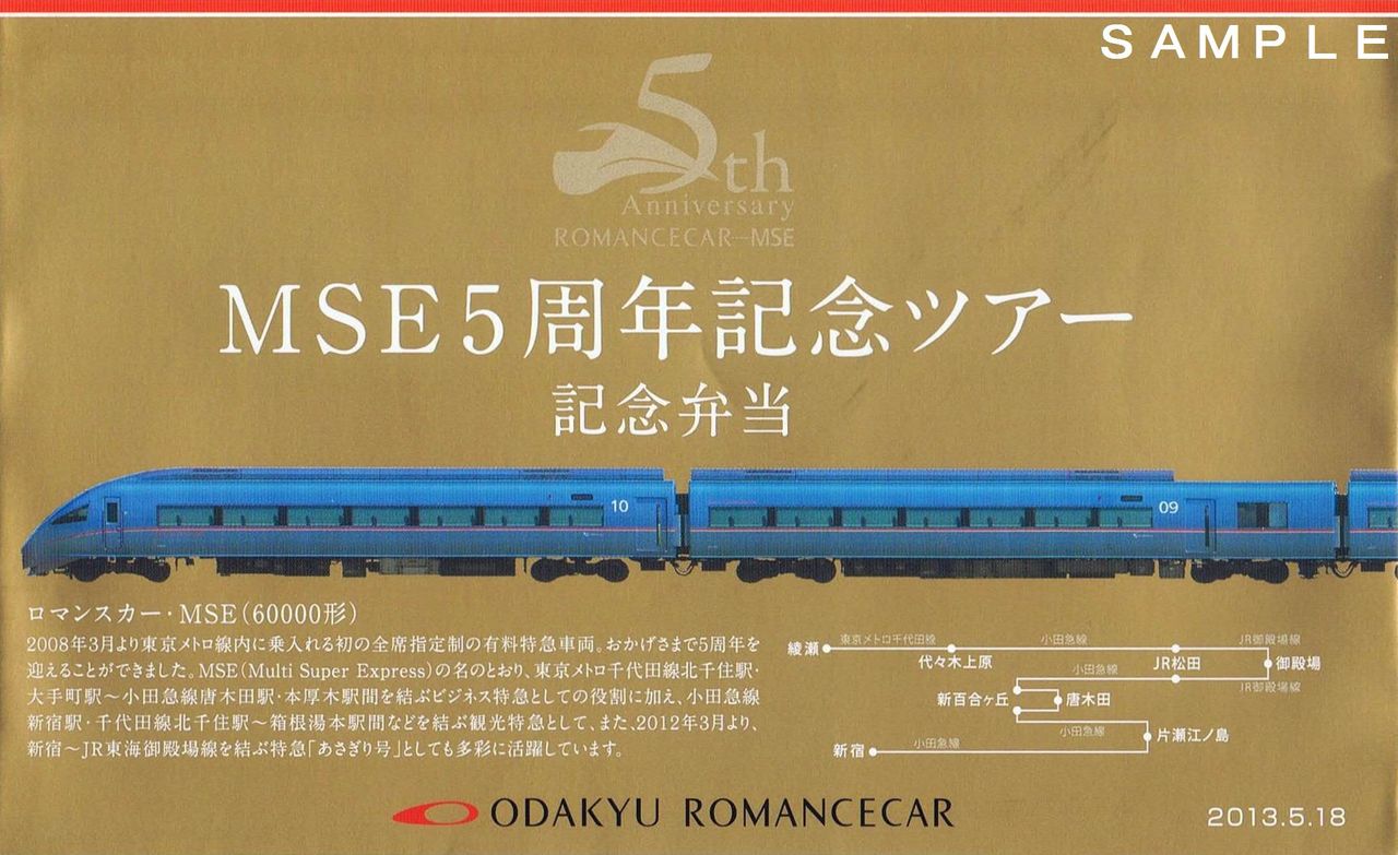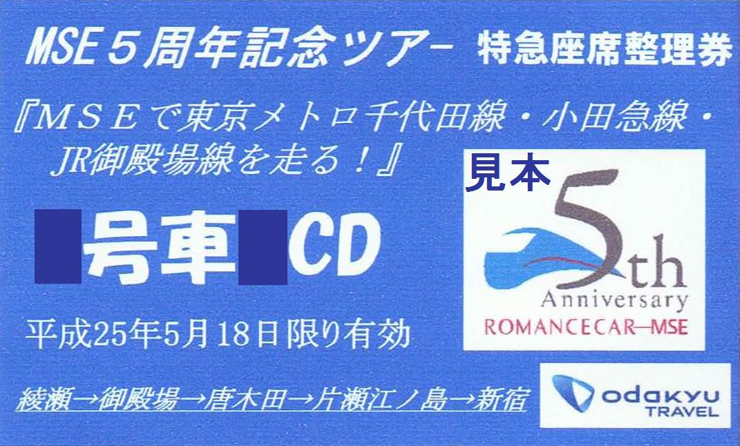 小田急トラベルではMSE(60000形)の就役5周年を記念して平成25年5月18・19・25・26日の4日間限定で、東京地下鉄(東京メトロ)千代田線・小田急各線・JR東海御殿場線を限定運行するツアーを企画・実施します(しました)。