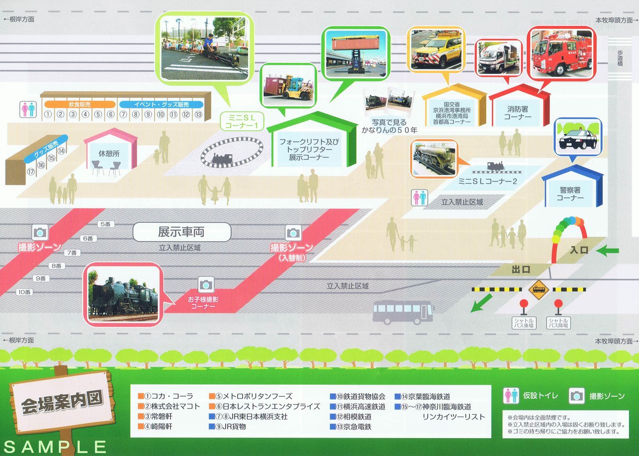 横浜本牧駅で開催された神奈川臨海鉄道創立50周年記念イベント会場で配布されていた神奈川臨海鉄道発行のA4サイズのチラシです。写真は表面の会場案内図。裏面はイベントプログラムが印刷されています。