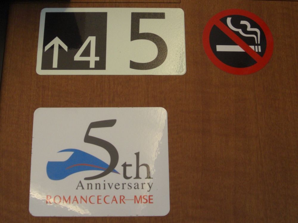 写真左は車内の号車ステッカー下に貼られた5周年記念ステッカー。お土産として配布されたステッカーも同じデザイン(レプリカ)でした。写真右は車内で記念撮影用として使用された記念ボード。