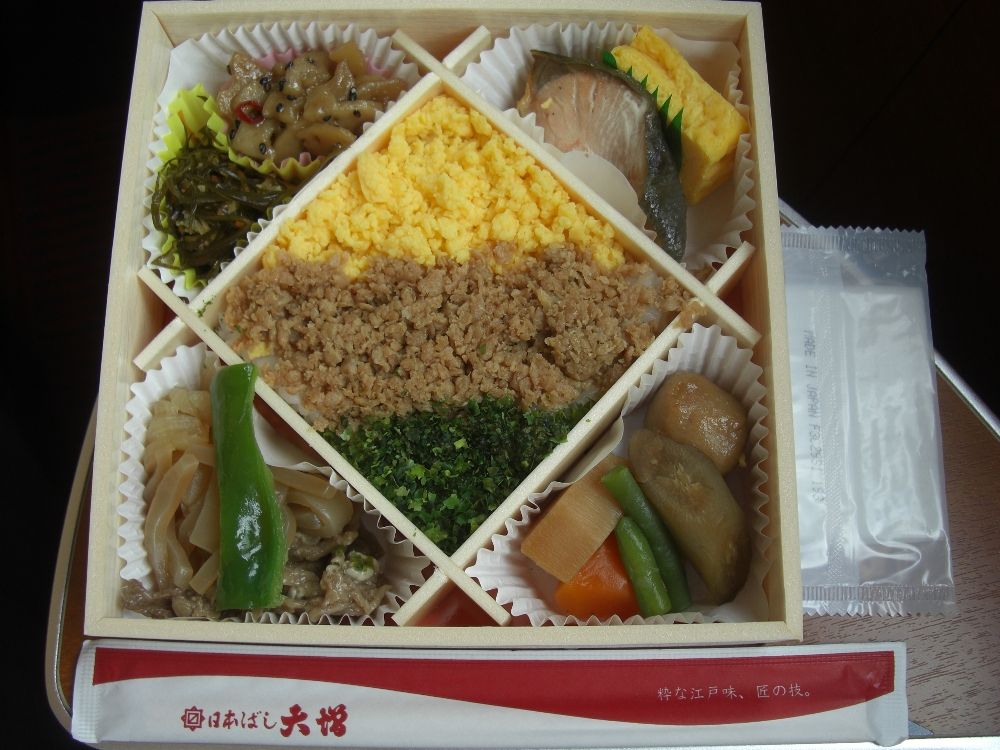 写真右下は中身。まん中の鶏そぼろ御飯が目立つので、一見、JR新宿駅弁『新宿弁当』と同程度のグレードの弁当かと思いましたが、青海苔入りで香り豊か。煮物もそれぞれの野菜毎に味付けを変えています。すき焼き風煮は肉がやわらかく煮込んであります。