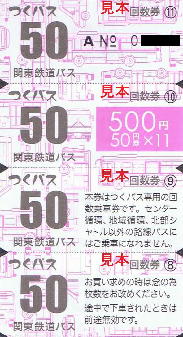 バスの運賃箱より発券される1日乗車券。小型過ぎてなくしやすそうです。つくつくバス(つくバスに統合)の一日乗車券は日付部分のみ感熱印字ですが、まだ立派な作りでしたから、この券を見たときの衝撃は大きいものでした。《つくバス回数券500円(平成25年4月10日収集)》