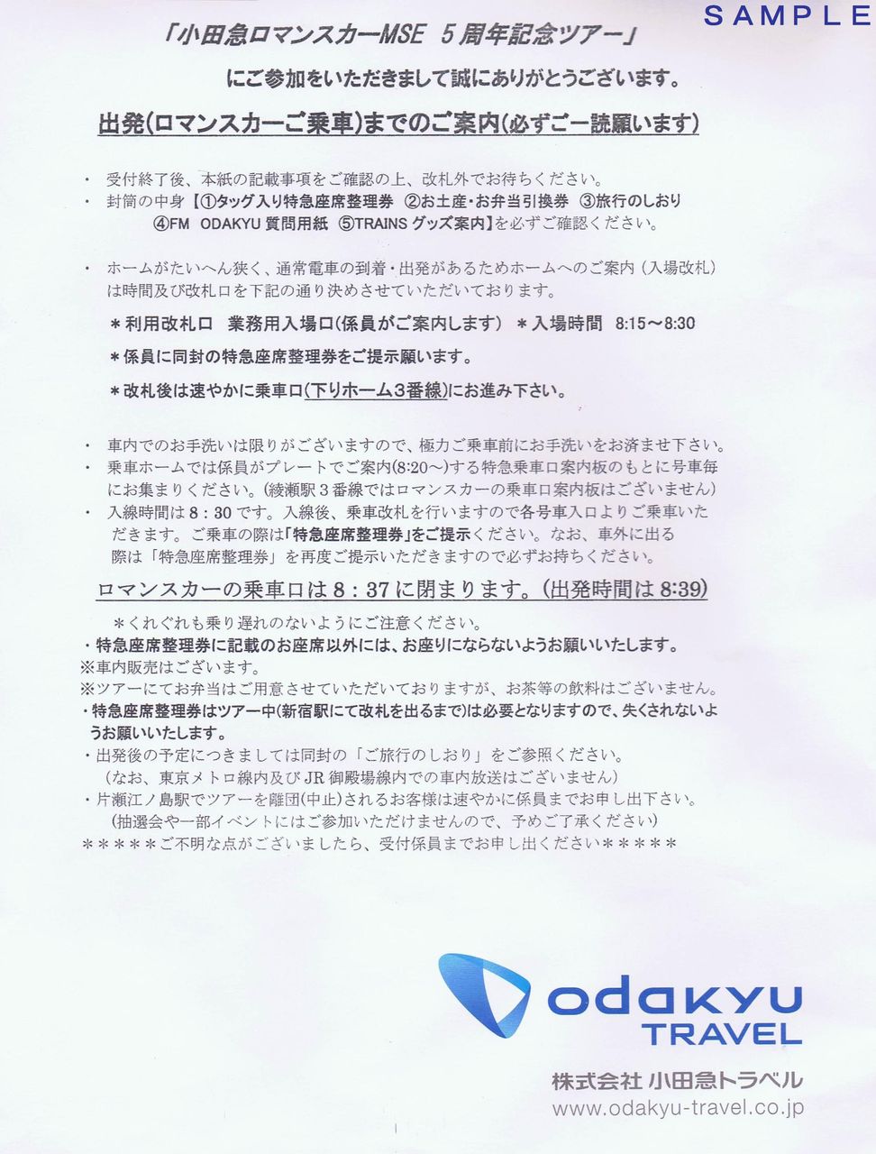 復路の御殿場線内で配布。旅行日が印刷済。裏面に運行経路が記載されています。《MSE5周年ピンバッジセット(ツアー限定)》
