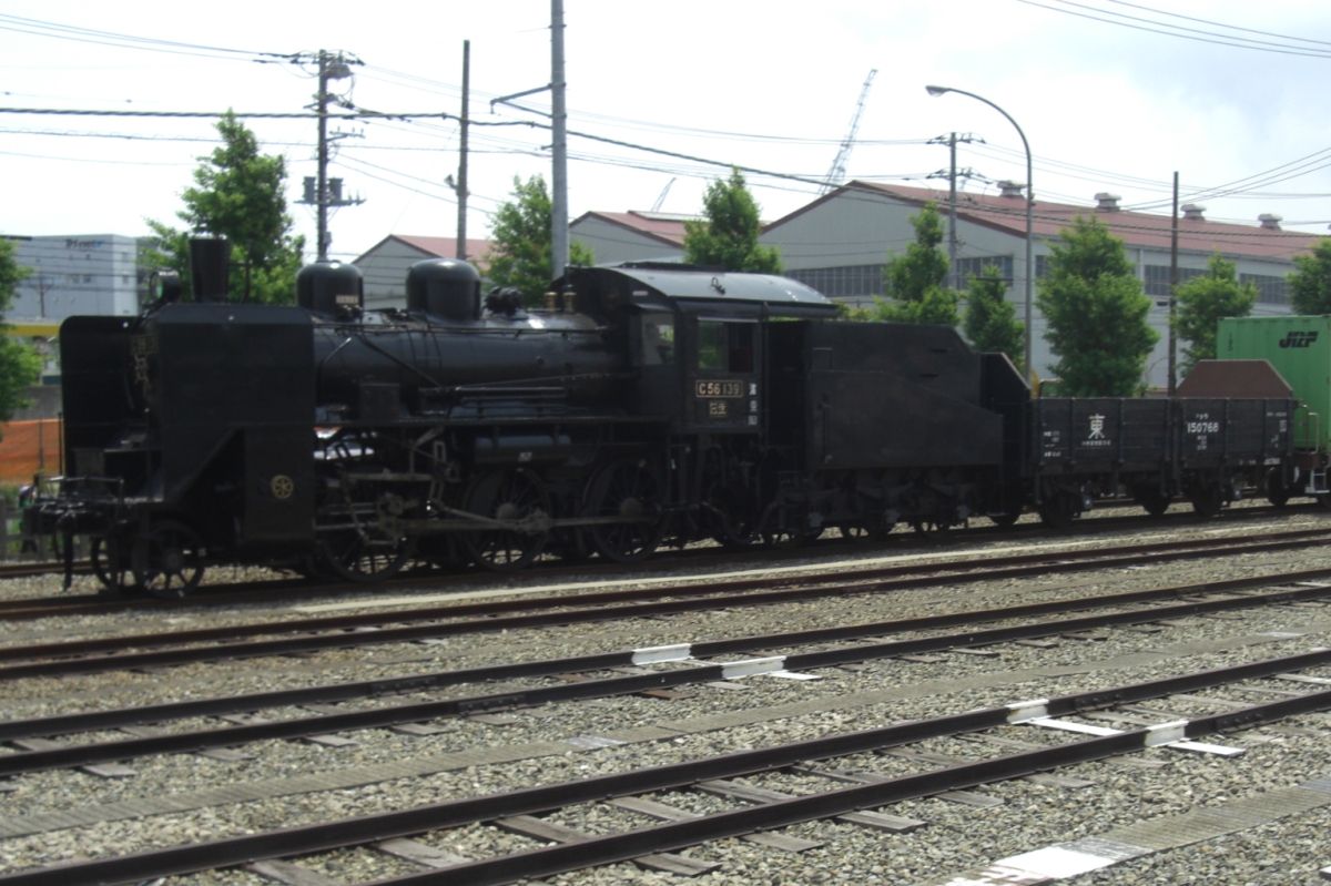 写真右はC56139。その後はトラ150768。さらにコキが連結されています。