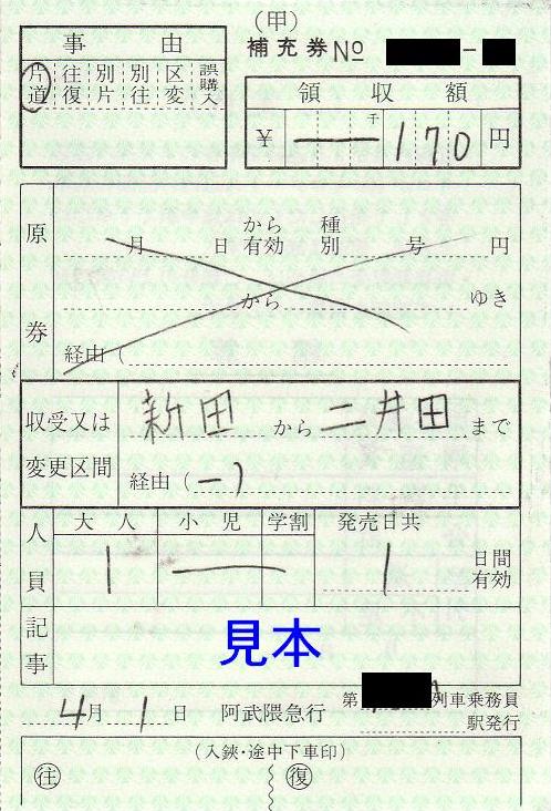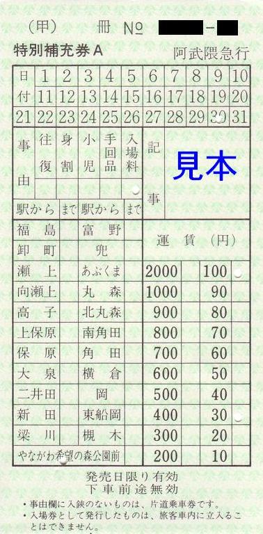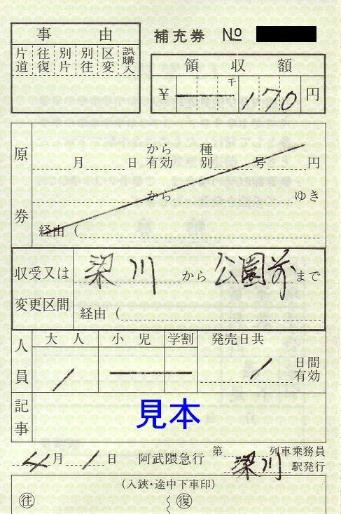 平成2年訪問時には車内・駅ともにこの券を扱っていました。入場券としての発行も出来るもので、写真のものはやながわ希望の森公園前駅で入場券として購入したものです。平成19年4月1日訪問時に訪問していない有人駅に残っていたのか不明ですが、その日に訪問した3駅(福島、梁川、やながわ希望の森公園前)で補充券と尋ねたら、先述の記入式のみでてきて、車掌に尋ねてみても『パンチ式は使っていません』という回答だったので、無くなったのかも知れません。
