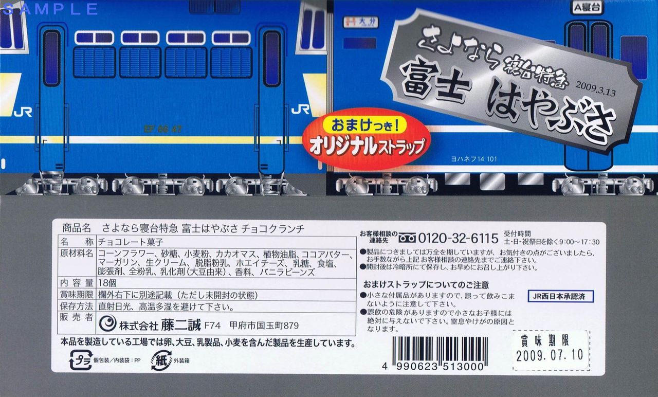 富士号、はやぶさ号の廃止を記念したチョコクランチ。販売者は前年の急行銀河号廃止時の記念菓子と同じく甲府市の株式会社藤二誠。JR東日本の駅構内で販売されていましたが、JR西日本承認済商品。
