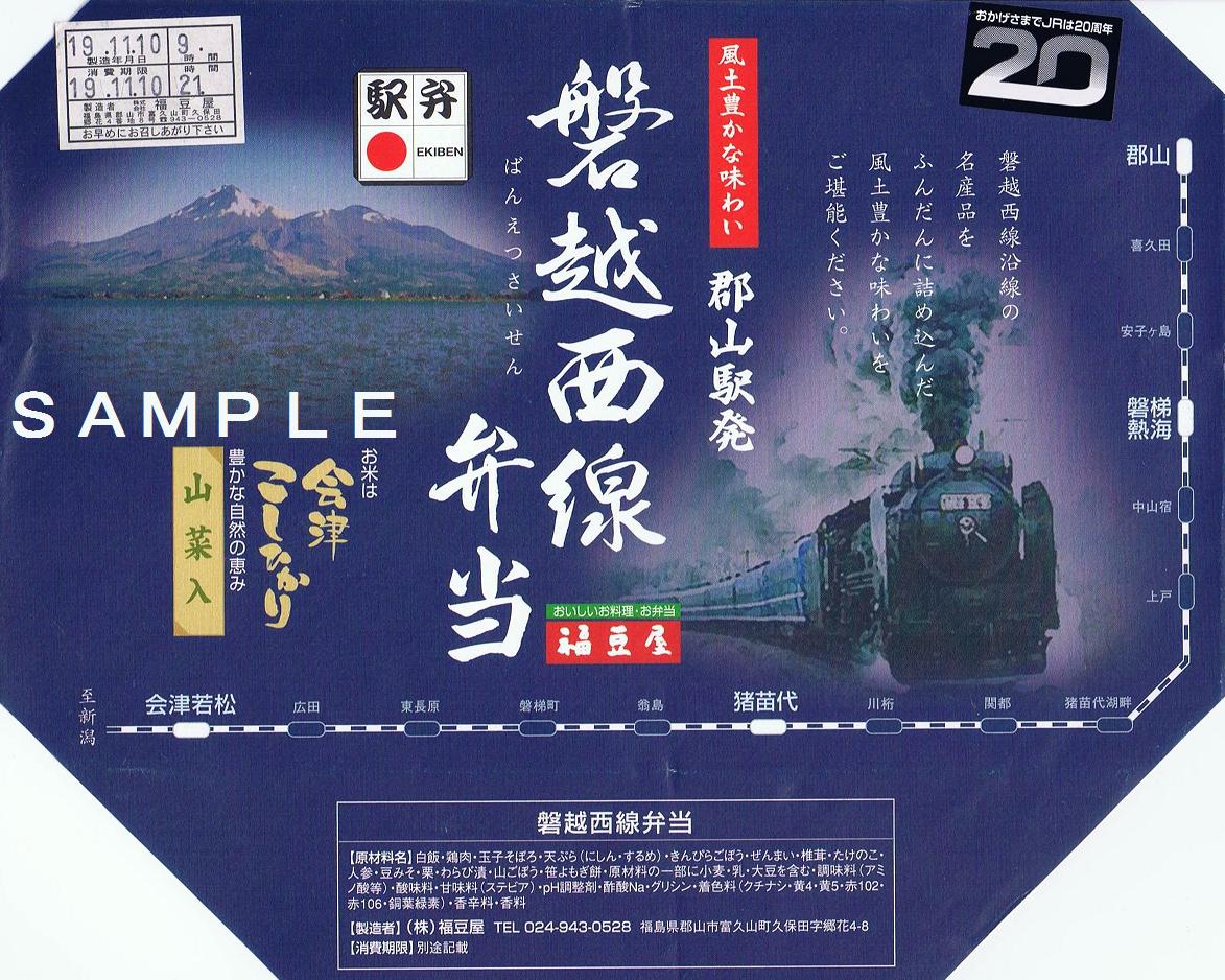 SLばんえつ物語号運行区間内で多くのSL関連駅弁が発売される中、SL磐梯会津路号運行区間側でも郡山駅弁業者の福豆屋が磐越西線弁当を発売しました。季節により2種類の掛紙があるようです。写真のものは東京駅構内駅弁屋旨囲門で購入しました。