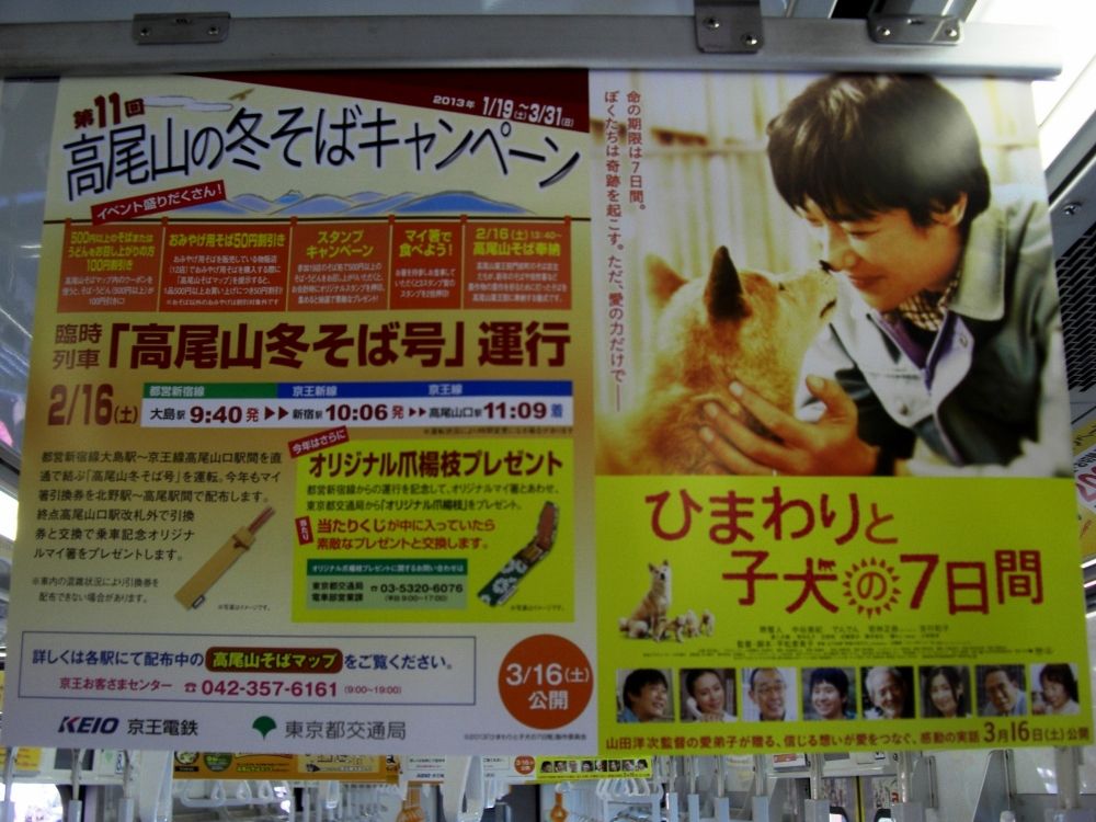 京王電鉄と東京都交通局共同で作成されたA2サイズのポスターで半分は堺雅人主演の映画『ひまわりと子犬の7日間』の広告になっています。この列車の広告はこのポスターと高尾山冬そばキャンペーンのポスターが掲出されており、高尾山口駅到着直後に他のポスターに変えられていました。希望者は外されたポスターが貰えました(写真は車内に掲出されていた時に撮影。ピンボケです)。