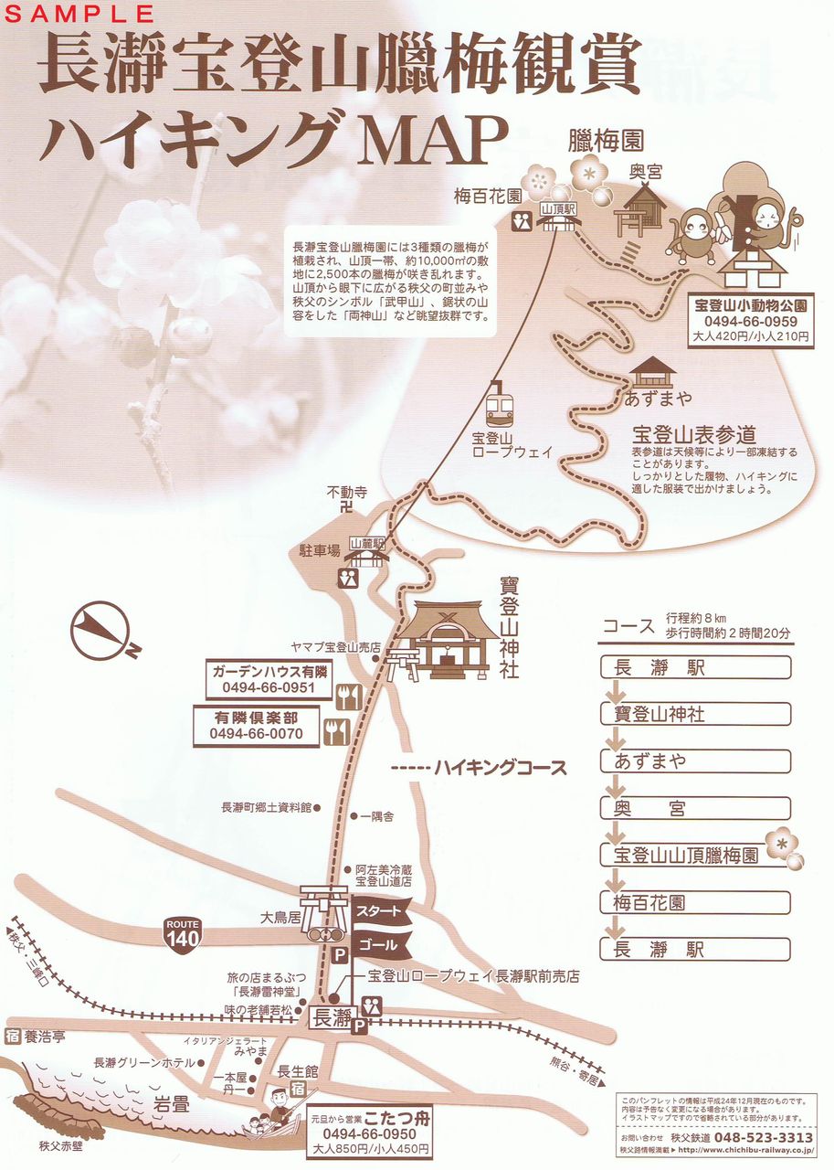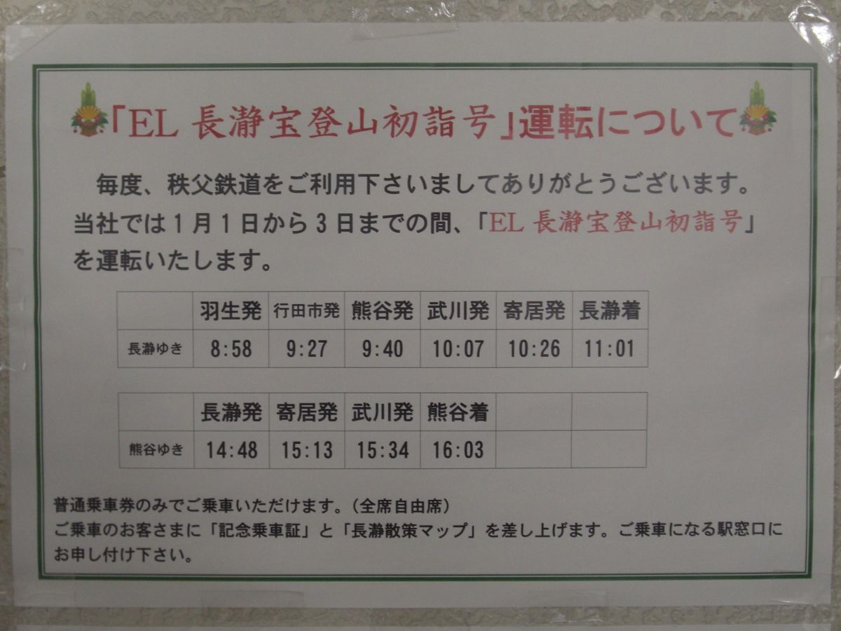 EL長瀞宝登山初詣号のご乗車特典二つ目。A4サイズ両面印刷のマップで平成24年12月時点の情報に基づき編集されています。特にマップ上に列車名が入っていませんので、今後別の機会に配布される可能性があるかもしれません。======================================