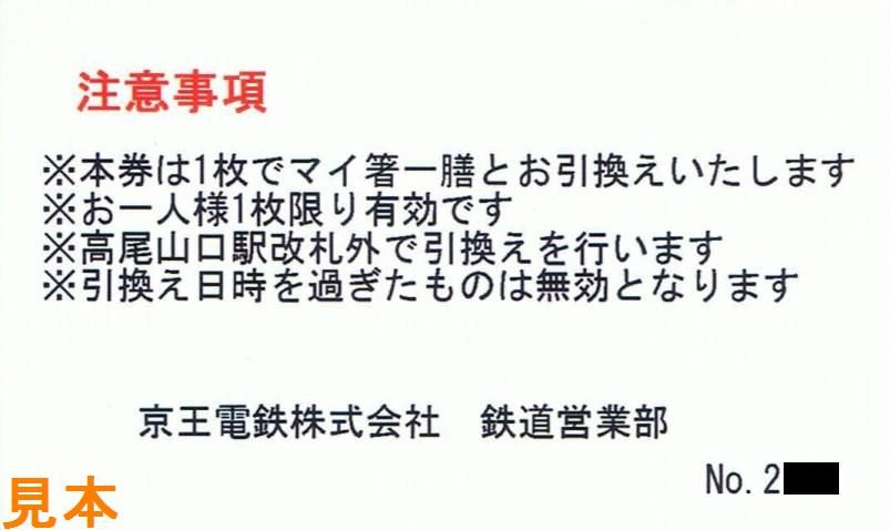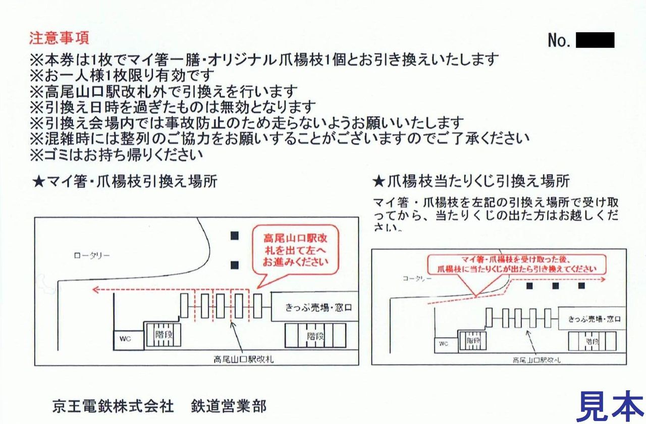 写真は車内で配布された引換券。「くじ」が無くなったため(京王電鉄が進めている仮称・高尾山温泉工事で引き換えスペースが少ないためと思われる)、前年度のハガキサイズから再び名刺用紙にプリンター印刷のものとなりました。裏面にナンバーが付いています。〔京王電鉄 2014冬そば号乗車記念マイ箸〕