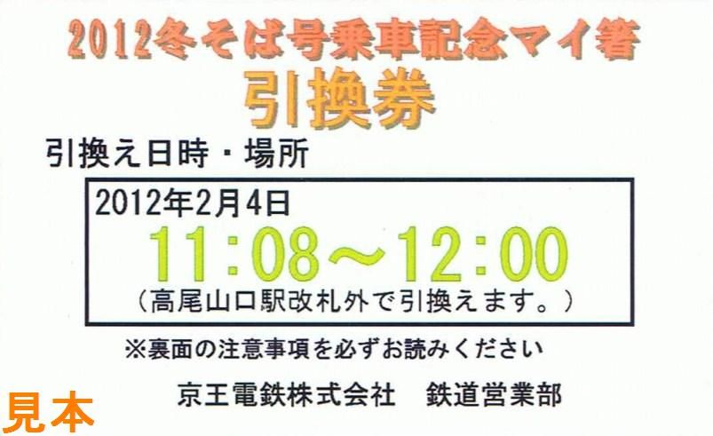 写真は車内で配布された引換券。前年度と同じく名刺用紙にプリンター印刷したもので、裏面にナンバーが付いています。〔京王電鉄 2012冬そば号乗車記念マイ箸(平成24年2月4日)〕